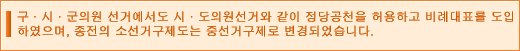 * ½Ã¡¤µµÀÇ¿ø¼±°Å¿¡ ´ëÇØ¼¸¸ Àû¿ëÇÏ´ø Á¤´ç°øÃµ°ú ºñ·Ê´ëÇ¥Á¦¸¦ ±¸¡¤½Ã¡¤±ºÀÇ¿ø¼±°Å¿¡ ´ëÇØ¼µµ µµÀÔÇÏ°í ºñ·Ê´ëÇ¥ÀÇ¿øÀº Áö¿ª±¸ÀÇ¿øÁ¤¼öÀÇ 10ºÐÀÇ 1¿¡ ÇØ´çÇÏ´Â Á¤¼ö¸¸ÅÀÇ ÀÇ¿øÀ» ¼±ÃâÇϵµ·Ï ÇÔ.