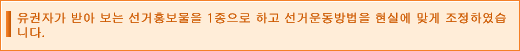 | * ±¹È¸ÀÇ¿ø ¹× Áö¹æÀÇȸÀÇ¿ø À硤º¸±È¼±°Å½Ã¿¡¸¸ Çã¿ëÇÏ´ø Çö¼ö¸·À» ºñ·Ê´ëÇ¥¼±°Å¸¦ Á¦¿ÜÇÑ ¸ðµç ¼±°Å¿¡¼ À¾¡¤¸é¡¤µ¿¸¶´Ù 1¸Å¾¿ °Ô½ÃÇÒ ¼ö ÀÖµµ·Ï Çϰí, ±× ³»¿ëµµ ¼±°Å¹ý¿¡ À§¹ÝµÇÁö ¾Ê´Â ÇÑ ÀÚÀ¯·Ó°Ô °ÔÀçÇÒ ¼ö ÀÖµµ·Ï ÇÔ.